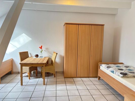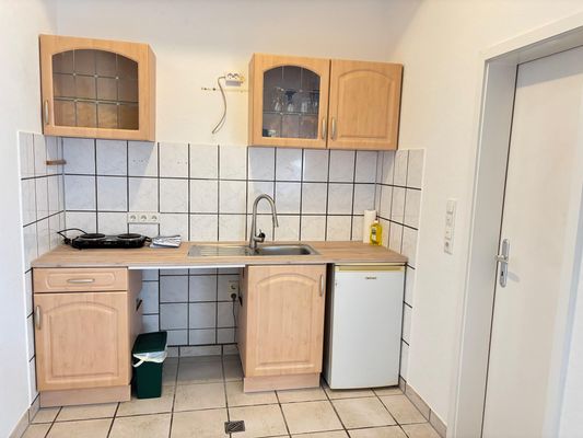Der kombinierte Wohn- und Schlafbereich ist praktisch und behaglich gestaltet. Zwei Einzelbetten sorgen für erholsamen Schlaf, während ein Sofa und ein TV zum Entspannen einladen. Große Fenster schaffen eine helle, freundliche Atmosphäre mit Blick ins Grüne. Die offene Küche ist direkt in den Wohnraum integriert und zweckmäßig ausgestattet. Zur Verfügung stehen ein Herd mit zwei Kochplatten, Kühlschrank, Mikrowelle, Toaster, Wasserkocher sowie Geschirr, Besteck und Küchenutensilien für die Selbstversorgung.