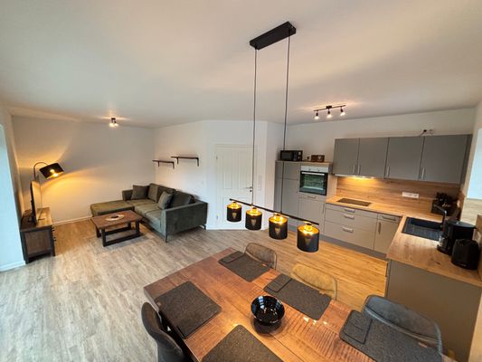 Das Ferienhaus erstreckt sich über zwei Etagen und verfügt insgesamt über fünf Zimmer, darunter drei separate Schlafzimmer mit eigenem Fernseher und Einbau-Kleiderschrank. Die großzügige, offene Küche ist zum Wohnbereich hin ausgerichtet und bietet eine komplette Ausstattung, die auch längere Aufenthalte angenehm gestaltet: Ein 4-Platten-Herd (elektrisch), Backofen, Mikrowelle, Geschirrspüler, Kühlschrank, ein separates Gefrierfach, Kaffeemaschine, Wasserkocher, Toaster, Eierkocher sowie zahlreiche Küchenutensilien stehen zur Verfügung. Ein großzügiger Esstisch mit gemütlichen Sitzmöglichkeiten schafft Raum für gemeinsame Mahlzeiten.
