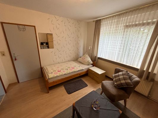 Die Wohnung hat eine Größe von 25m² und ist unterteilt in Wohn-/Schlafzimmer, Kochecke sowie einem Badezimmer. Sie ist für max. 1 Person ausgestattet. Das Bett im Schlafzimmer verfügt über 90x200cm Liegefläche. In der Küchenecke stehen Elektrogeräte wie z. B. Kaffeemaschine, Wasserkocher, Mikrowelle, Toaster sowie eine Kochgelegenheit (mit 2 Herdplatten) zur Verfügung. Selbstverständlich ist auch ein TV und ein Radio vorhanden. Es handelt sich hierbei um eine Nichtraucher-Unterkunft und Haustiere sind leider nicht erlaubt.